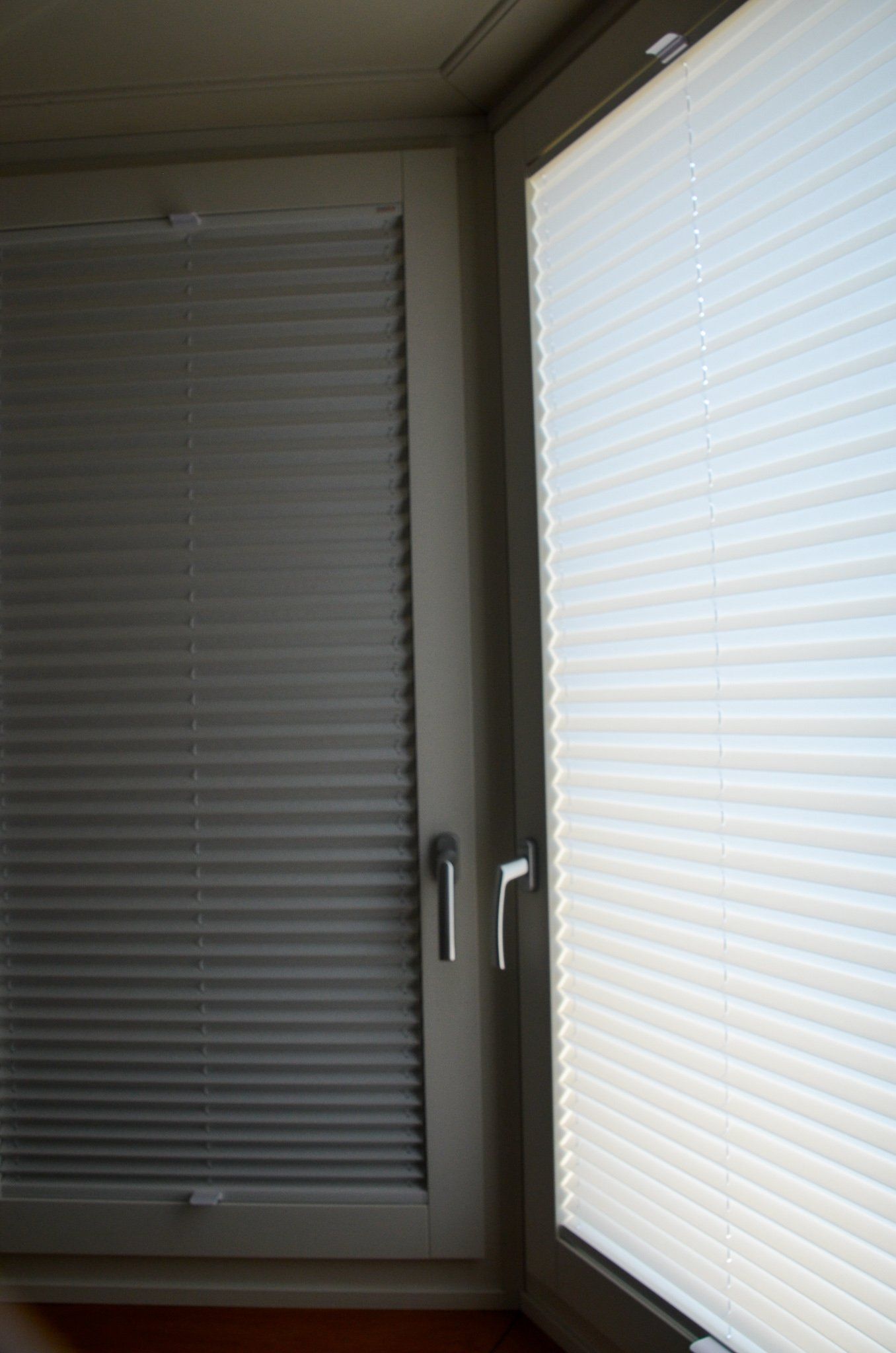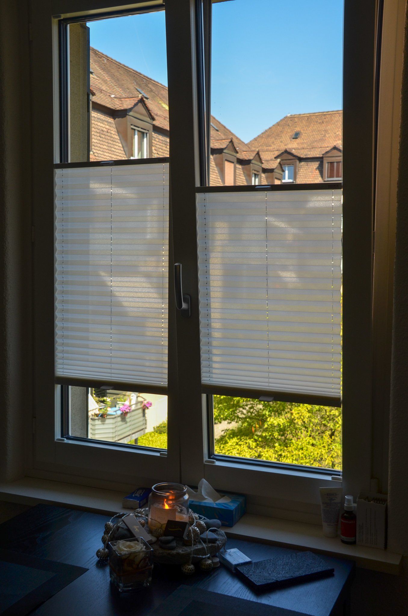 Zwei schöne Insektenschutz Plissee montiert, das eine perfekt, auf die Farbe vom Fensterahmen angepasst und genau in der grösse der Mauerleibung am Fensterrahmen angeklebt.